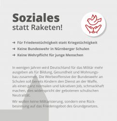 Susanne Lauer (27) Platz 3, Sozialpädagogin. „Das Bildungssystem darf nicht weiter militarisiert werden. Nicht nur Unis, sondern auch an Nürnberger Schulen werden immer mehr ein Ort von Rekrutierungsstätten. Dies sind jedoch Orte der Bildung mit einem Neutralitätsgebot. Schluss mit den Anwerbeversuchen durch Offiziere!“