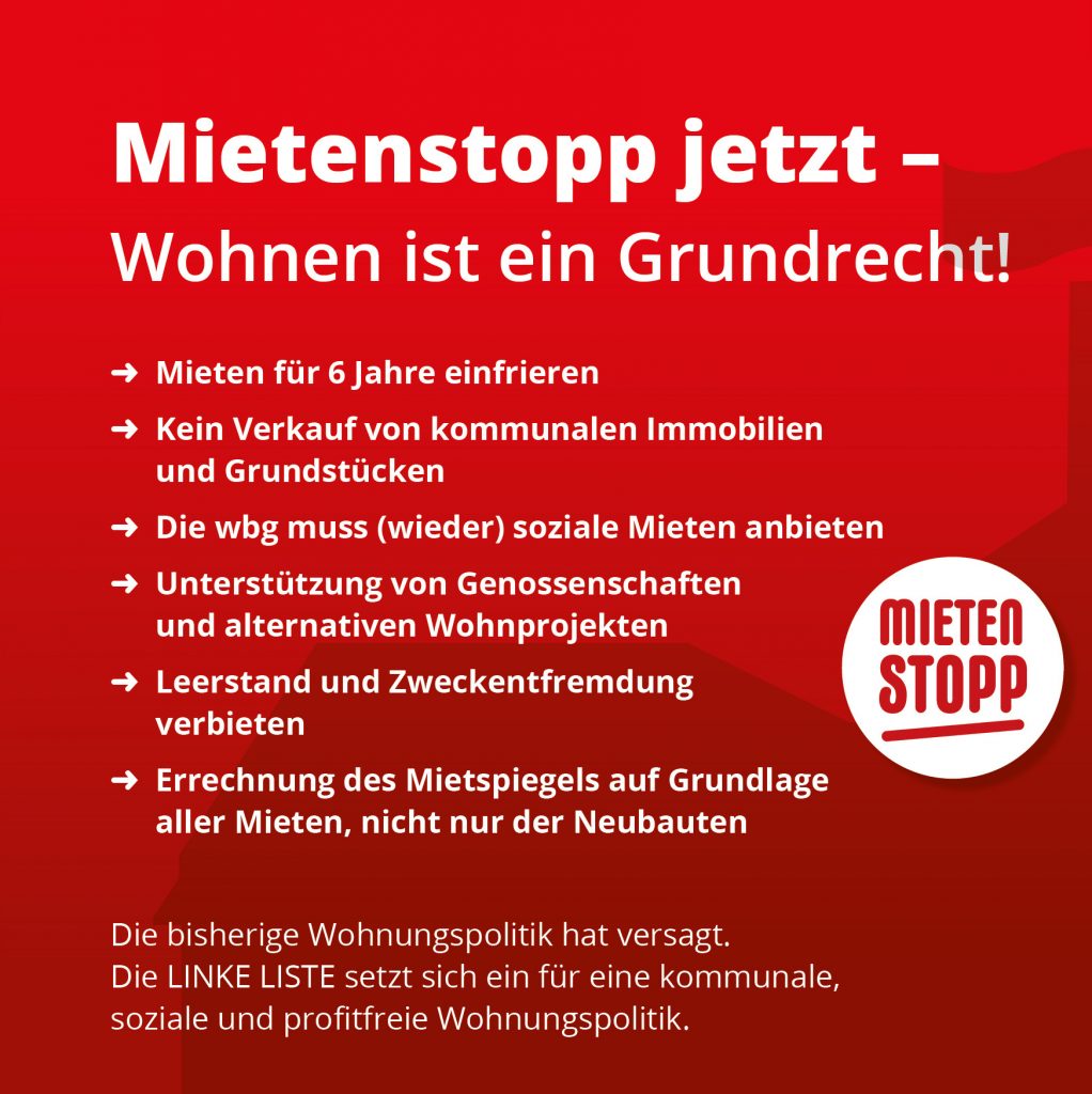 - Bezahlbaren Wohnraum durch eine soziale, kommunale und profitfreie Wohnungspolitik